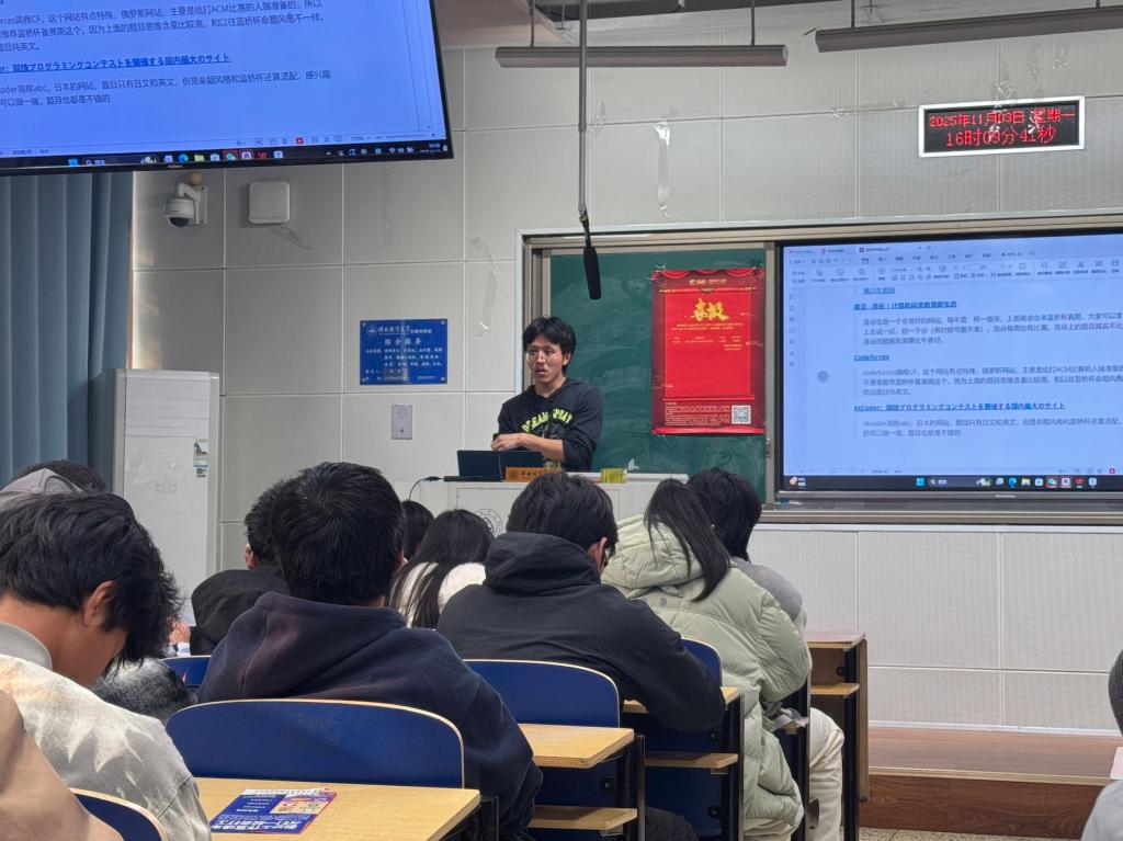 孙经理发表了热情洋溢的致辞。他首先对在第十六届蓝桥杯比赛中获奖同学表示热烈的祝贺,并对指导教师的辛勤付出表示衷心的感谢。孙经理强调了蓝桥杯等高水平学科竞赛在培养员工创新精神、实践能力与团队协作意识方面的重要作用,是检验教学成果、提升员工综合素质的有效平台。他鼓励同学们积极投身于此类竞赛,勇于挑战自我,在实战中锤炼专业技能,并预祝同学们在即将到来的第十七届蓝桥杯中再创佳绩。随后,孙立辉经理亲自为在第十六届蓝桥杯全国总决赛中获奖的员工颁奖,现场掌声雷动,气氛热烈。史正阳同学作为优秀员工代表发言,他不仅在第十六届蓝桥杯中荣获国赛奖项,同时也是学校ACM程序设计竞赛队的队长。史正阳同学结合自身多次参与大型编程竞赛的丰富经验,从赛前知识储备、算法训练方法、时间管理、心态调整以及团队协作等多个维度,向在场的学弟学妹们分享了宝贵的备赛心得与实战技巧,为有意参赛的同学提供了清晰的学习路径和积极的榜样力量。负责竞赛组织工作的薛学亚老师就第十七届蓝桥杯的报名事宜进行了详细讲解,对同学们普遍关心的问题进行了现场解答,并提醒同学们务必密切关注官方通知,严格按照规定时间完成报名,并鼓励大家提前准备,积极备战。