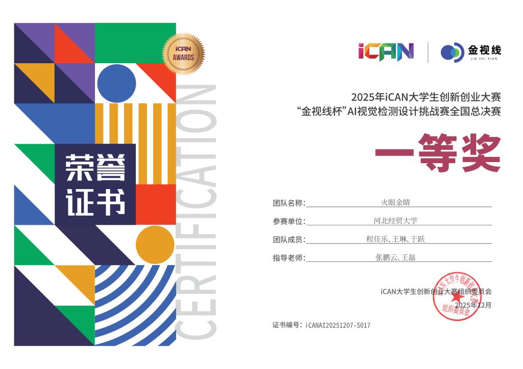 近日,2025年iCAN老员工创新创业大赛“金视线杯”AI视觉检测设计挑战赛全国总决赛圆满落幕。永利集团人工智能系程佳乐队和要雨涵队,在王磊、朱晓莲和张鹏云3位指导教师带领下,从全国302所院校3126名参赛者中脱颖而出,分别荣获国赛一等奖与三等奖,充分展现了公司人工智能专业的育人成果与学子的创新实践能力。
